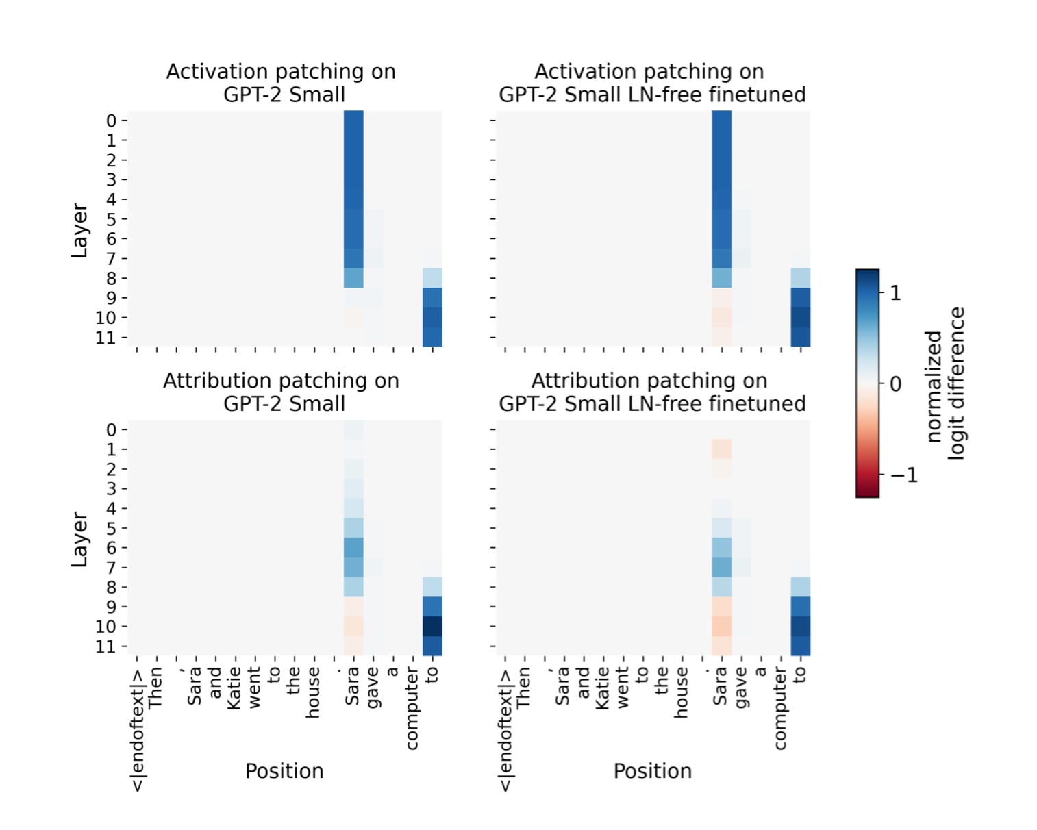 Activation patching and attribution patching applied on the residual stream at different layers and different positions on GPT-2 Small and the corresponding LN-free versions. (using the residual stream preceding each block)