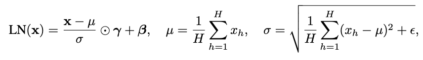 LN centers the activations by the mean and normalizes by the standard deviation, then multiplies by learnable scale and adds a learnable bias.