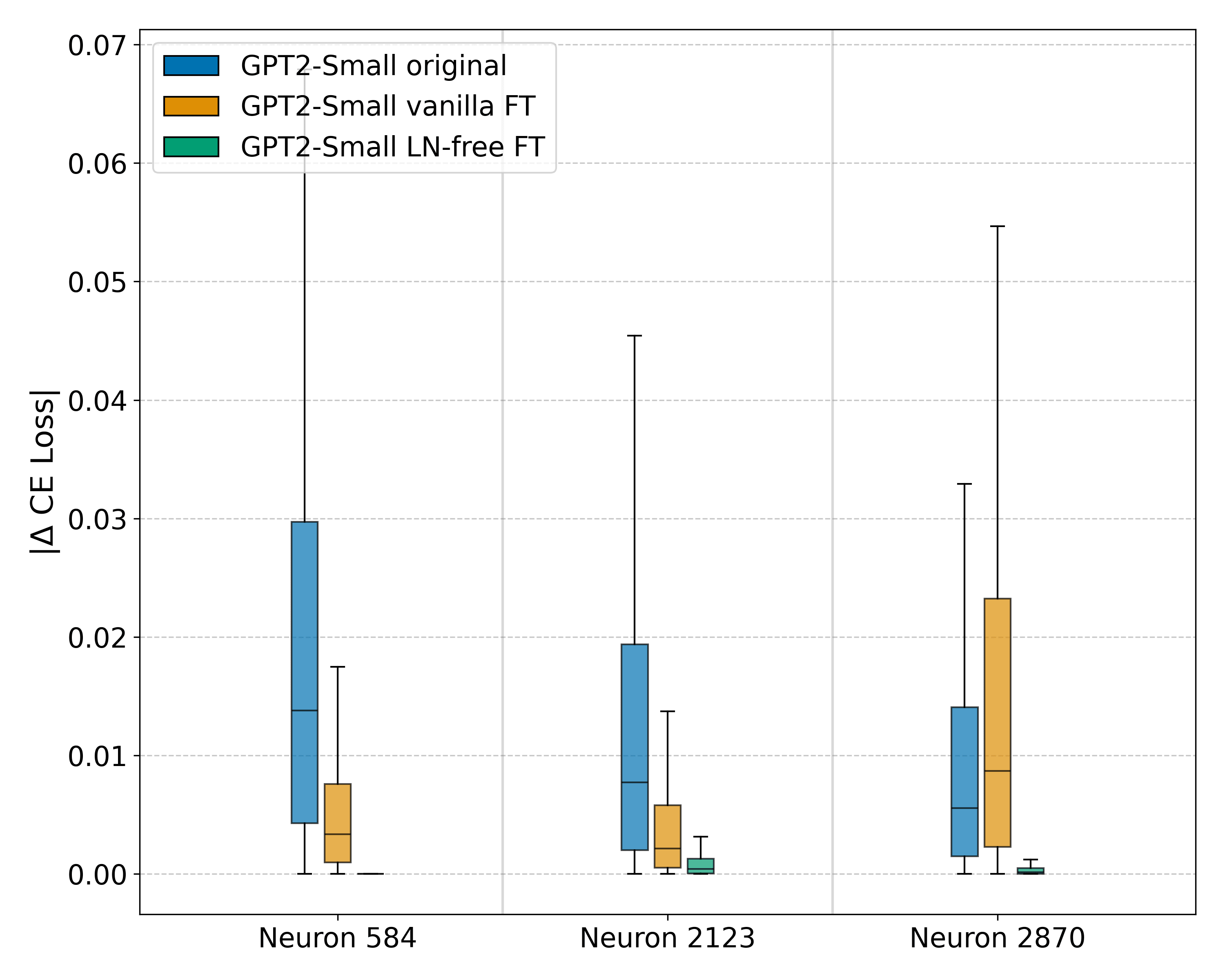Performance gap: We found that there is a small, but consistent gap in LN-free models’ performance. Additionally, we found that GPT-2 XL LN-free performs substantially worse on a tiny subset of examples in The Pile dataset; Lack of LN, disabled confidence neurons and the removal procedure itself could all contribute to this gap.