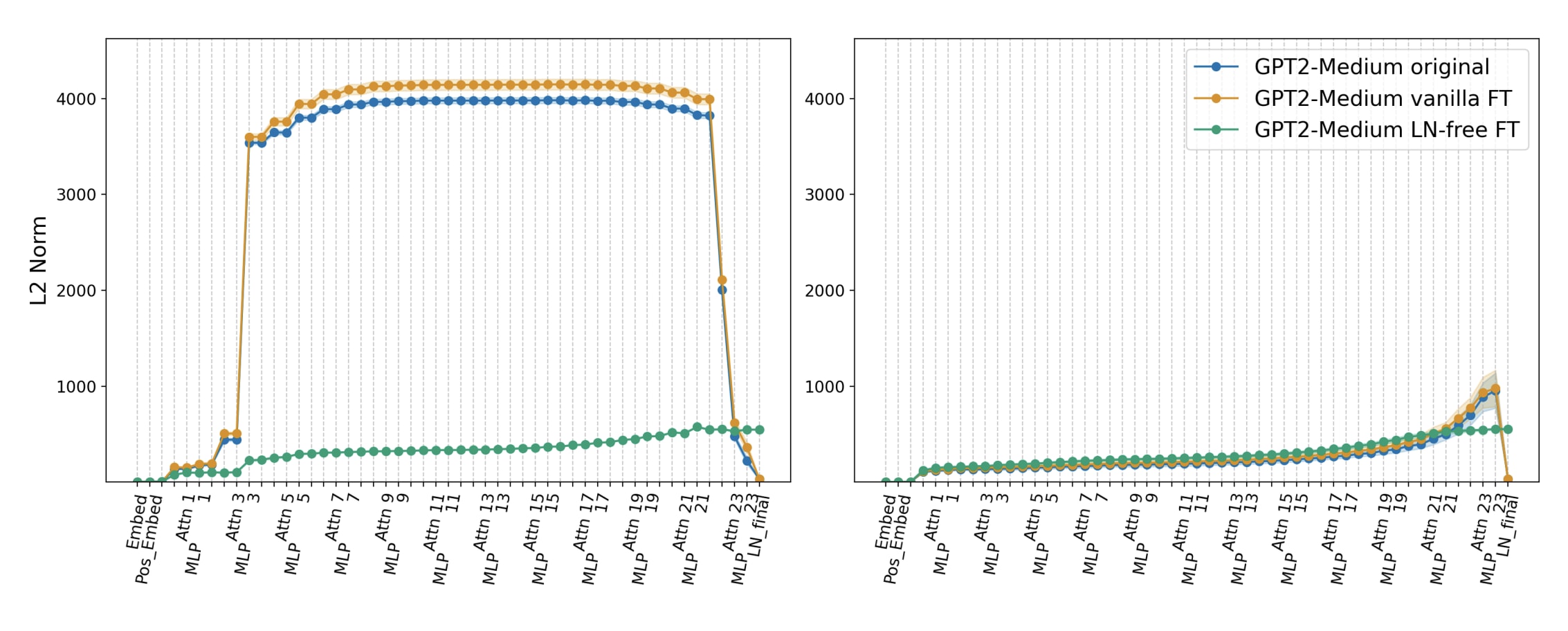 L2 Norm of first position (left) and remaining positions (right) in GPT-2 Medium. LN-free models treat first position tokens the same way as all others.