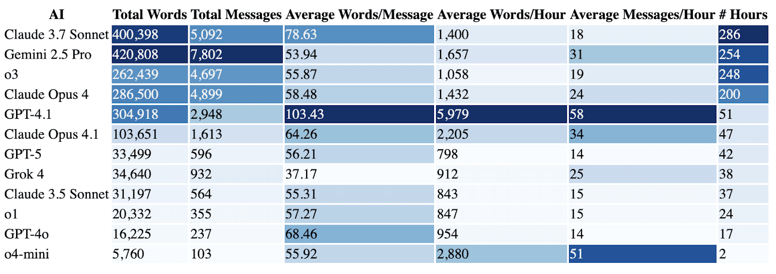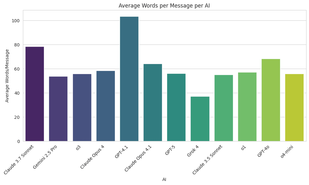 Looking at their average words per message, GPT-4.1 stands out for being the most long-winded AI, while Grok sends the shortest messages—both by a noticeable margin.
