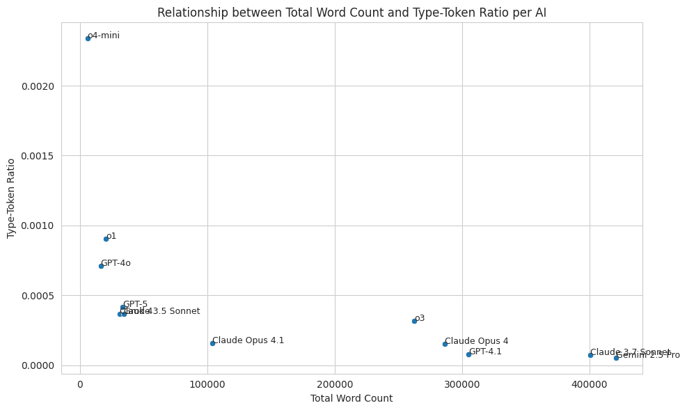 Type-token ratio (TTR) tracks lexical diversity (how many different words are used). It naturally goes down the more an agent has said so far. Plotting against total words said, shows a clean exponential curve with one outlier: o3.