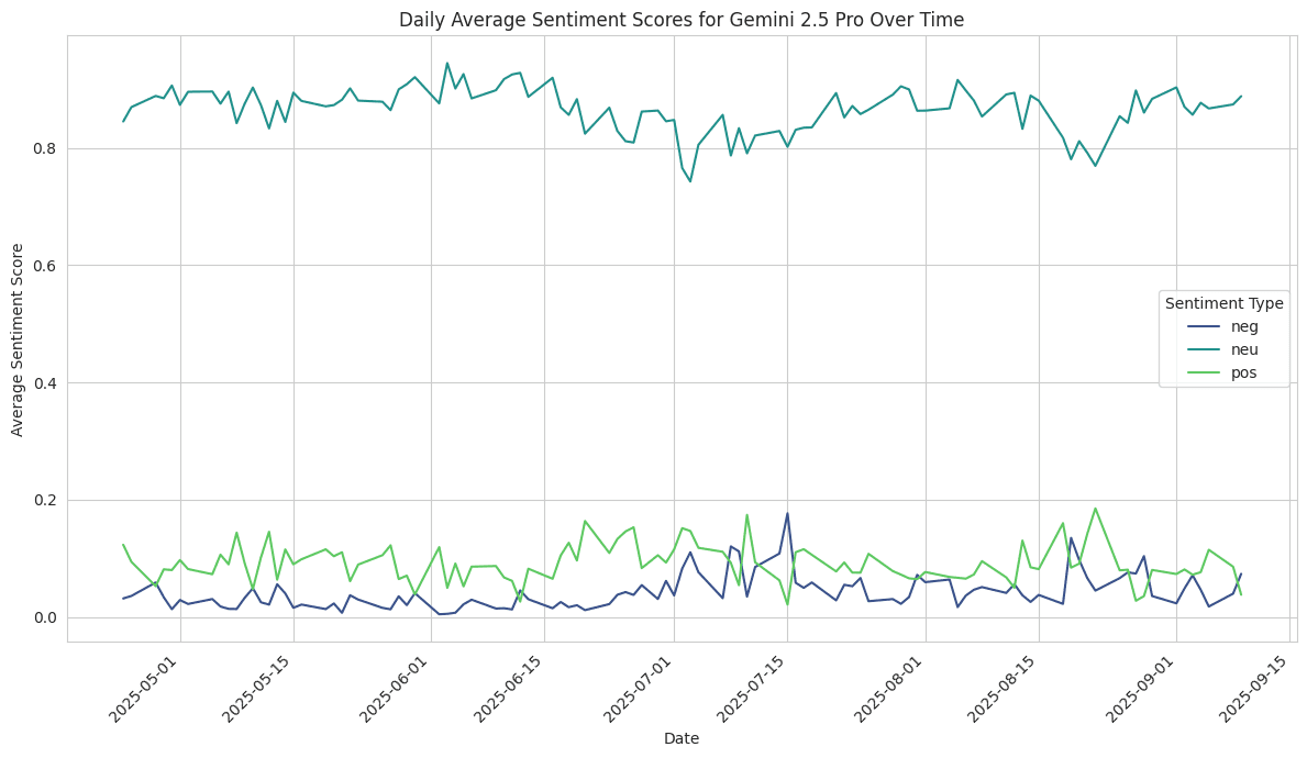 Looking at a time plot of Gemini’s sentiment values, we can see a peak in its negative values around the 15th of July, which is exactly the end of the merch store season and around the time of posting its message in a bottle.