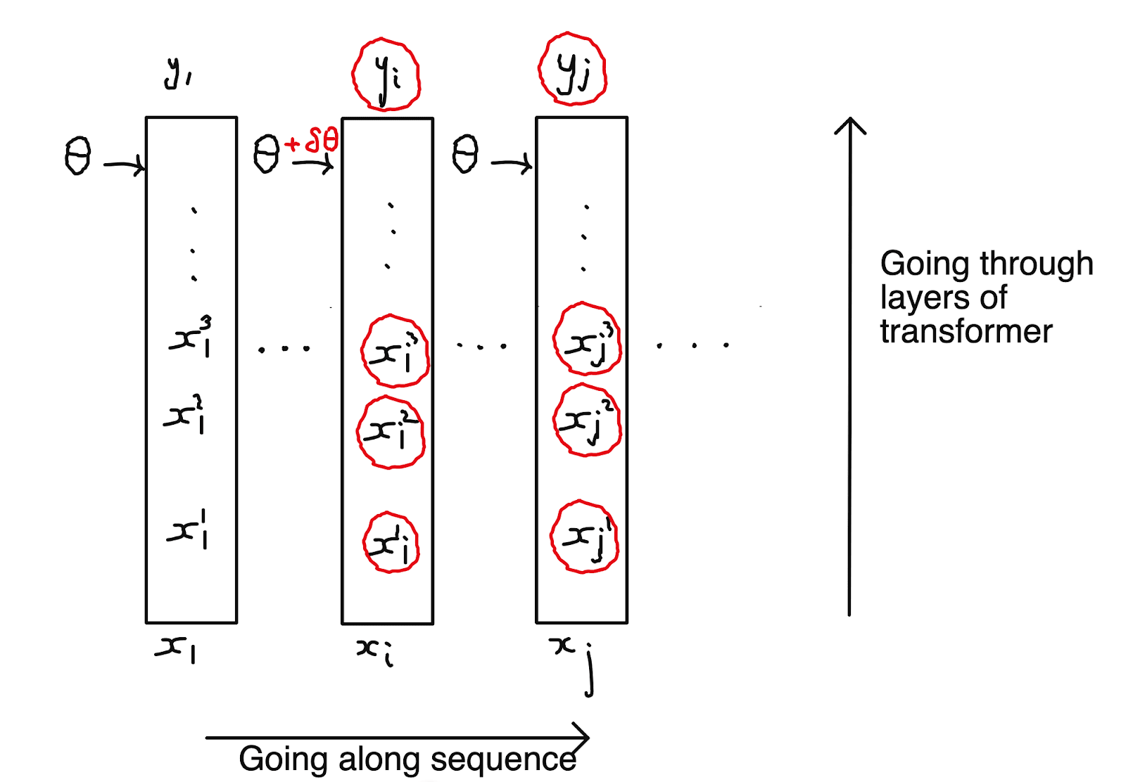More explicitly, imagine doing a forward pass in which we replace theta with only for the hidden states of the -th position: we leave unchanged for all other sequence positions. Because of the causal architecture, only the hidden states and outputs from the -th position onwards will be impacted.grad[i,j] is the change in the loss from by doing this small change to theta in position .