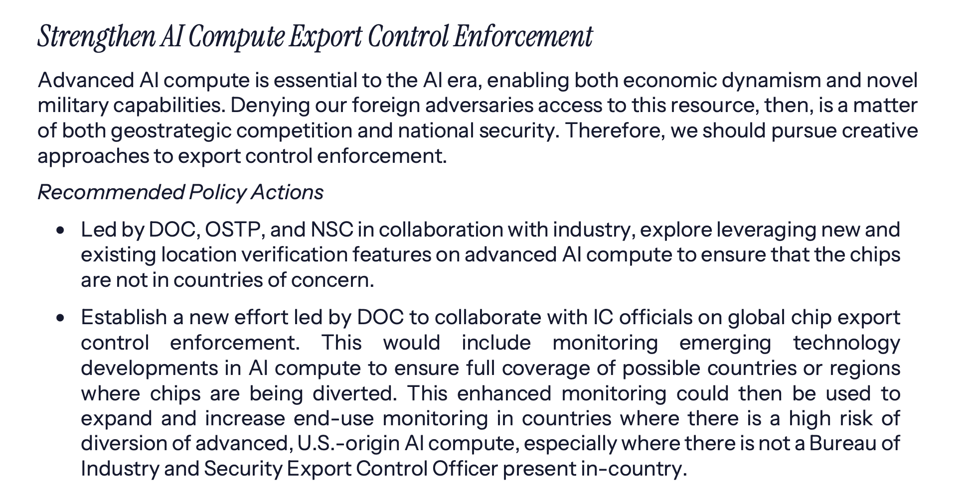 The AI Action Plan has a section on this, it recommends that Commerce and IC coordinate on enforcement, including monitoring.