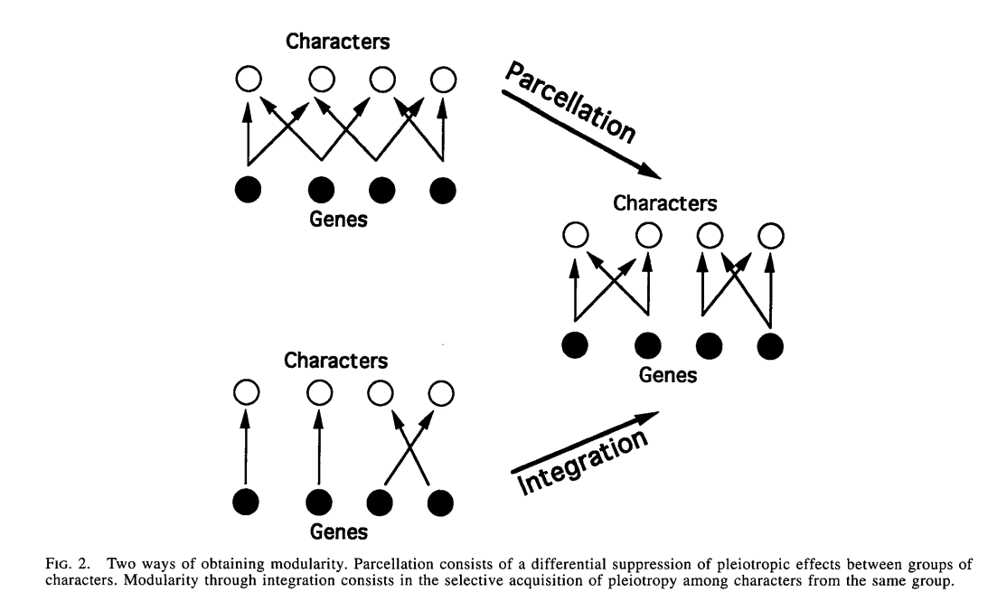 Genomic parcellation. Pleiotropic genes affect multiple characters of an organism. Genetic loci might therefore be under antagonistic selection pressure: a mutation might have beneficial effects on one character and deleterious effects on another character. This situation also creates pressure to remove the pleiotropy, e.g. by differentially expressing paralogs or by alternative splicing, so that fewer loci affect multiple characters. When a pleiotropy is removed, the gene is made more explicit: it is more available to be modified as is suitable for different applications (different expressions in different contexts). See the work of Günter Wagner, e.g. “Complex adaptations and the evolution of evolvability” (pdf link). A figure from that paper: