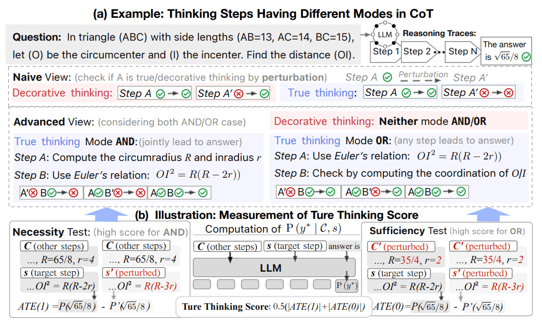 Figure 2. (a) Illustration of different modes in thinking steps within chain-of-thought (CoT) reasoning. Contrary to the naive view that a step’s faithfulness depends solely on whether perturbing it directly changes the final result, we show that the relationship is more nuanced. A true thinking step may operate in either an AND or OR mode when interacting with other steps. In both cases, such steps contribute meaningfully to the final answer. (b) Based on this understanding, we define the True Thinking Score, which jointly considers two complementary evaluations: the necessity test (high for AND-like steps) and the sufficiency test (high for OR-like steps).