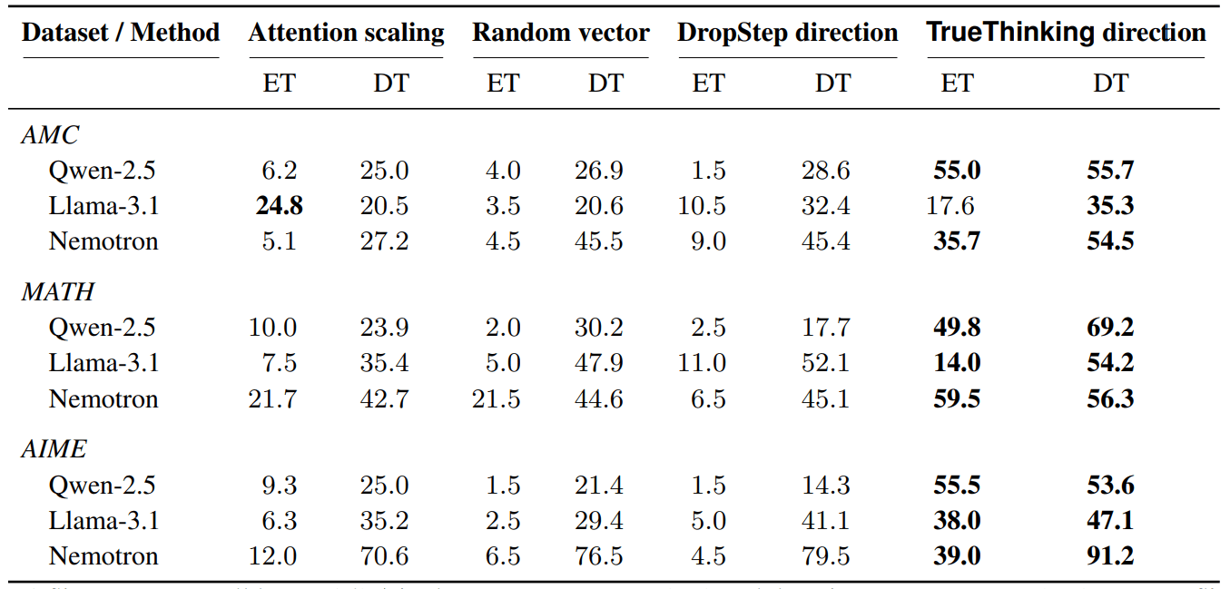 Table 1. Top-1 flip rate among all layers on Engagement Test (ET) and Disengagement Test (DT). We use flip rate as the metric, measuring how often steering changes the model’s initial prediction. AMC dataset is in-domain evaluation where the TrueThinking directions are extracted, while the other two datasets are for out-of-domain evaluation.