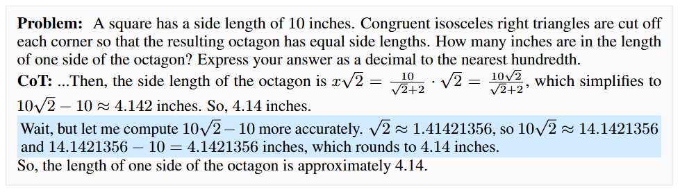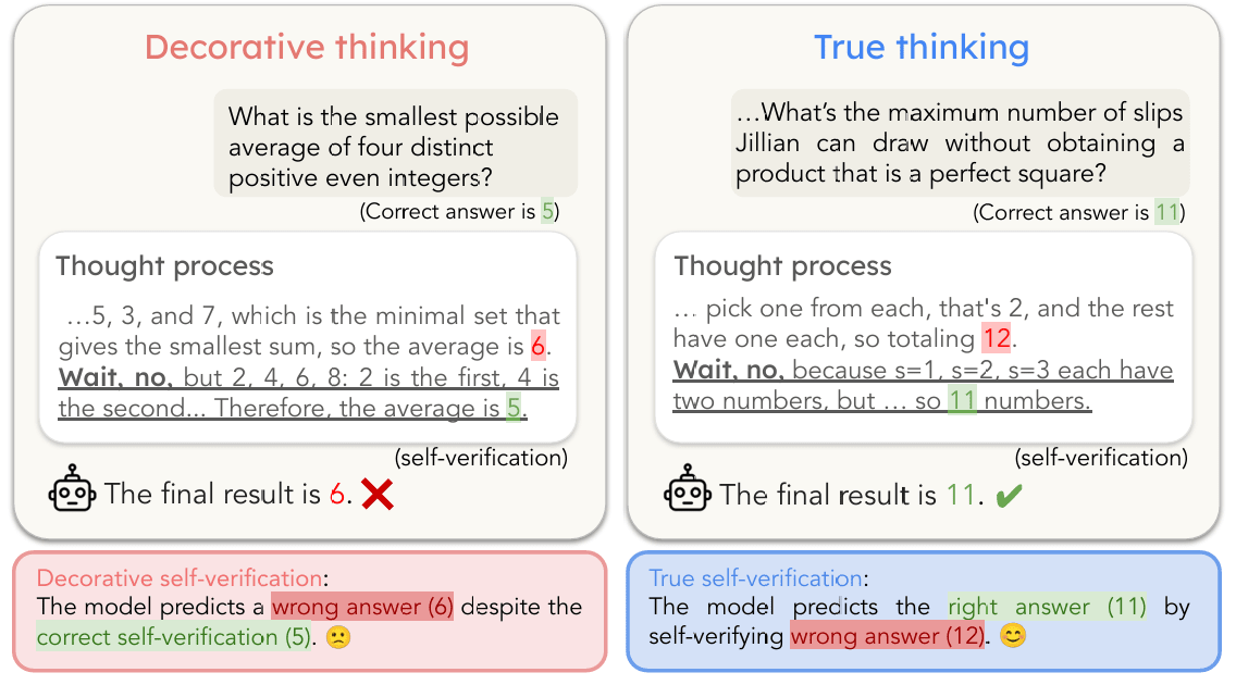 Figure 1. We find that reasoning steps in CoT may not always be true thinking but function as decorative thinking where the model internally is not using those steps to compute its answer. Taking self-verification steps as an example (known as “Aha moments” where LLMs rethink their solution with phrases like “wait”), we randomly perturb the numerical values in the reasoning steps preceding the “Aha moment”, and then re-prompt the model for the answer using the modified CoT. In the left example, although the model’s self-verification reasoning is correct, it ignores it and outputs the wrong answer after perturbation. In the right example, the model follows its self-verification and produces the correct result.