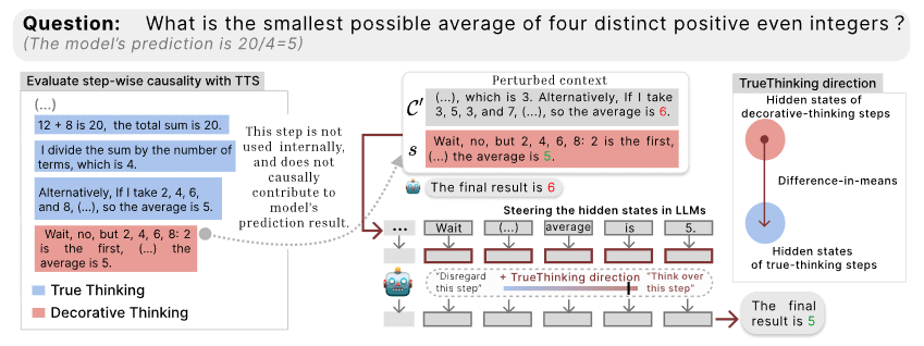 TL;DR: We analyze the causal contribution of each reasoning step in a Chain-of-Thought (CoT) to evaluate its faithfulness with respect to the model’s final prediction. Our findings reveal that while some steps are true-thinking steps: faithfully reflected in the model’s internal computation and exerting strong causal influence on its prediction: the majority of CoT steps are decorative, exhibiting minimal causal impact and not genuinely used by the model during inference. Furthermore, our results suggest that “thinking” is encoded as a steerable latent variable in LLMs. By steering along a simple linear direction in the latent space, we can control whether the LLM internally engages with or disregards a verbalized CoT step during reasoning.