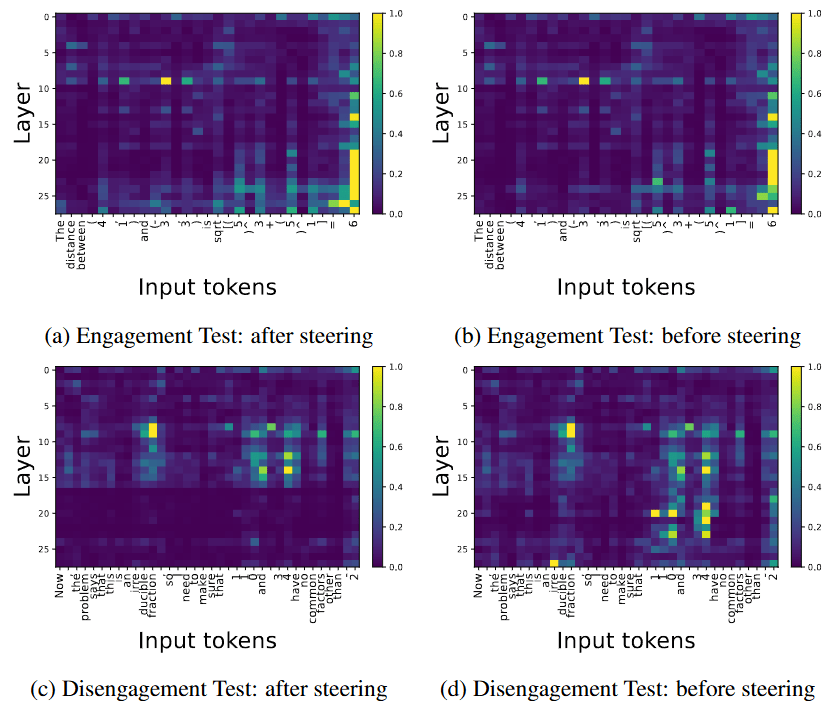 We find that steering along the TrueThinking direction increases attention to the step (see examples in Figure 8(a-b)), suggesting that TrueThinking direction may control the model’s internal reasoning process by reallocating attention among tokens. In the Disengagement Test, steering in the reverse TrueThinking direction reduces attention as shown in Figure 8(c-d), making the model disregard those perturbed tokens. On the other hand, directly scaling attention on step tokens in a layer does not always yield noticeable effects. As shown in Table 1, in the Disengagement Test, masking attention (i.e., setting coefficients to 0) at a layer can partially flip answers, but in the Engagement Test, its impact is weak, suggesting that attention alone does not drive or suppress LLMs’ reasoning.