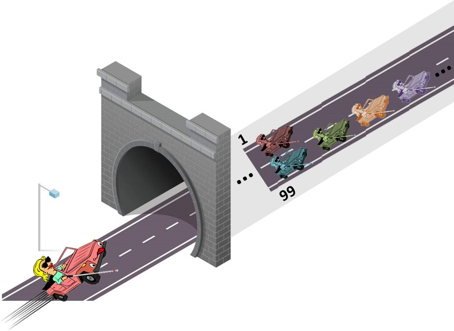 You’re driving along, when you turn into a dark tunnel and are automatically shunted into the left or the right lane. You can’t see whether there are any other cars in your dark lane, but the car radio announces “there are cars in the right lane and in the left lane”.