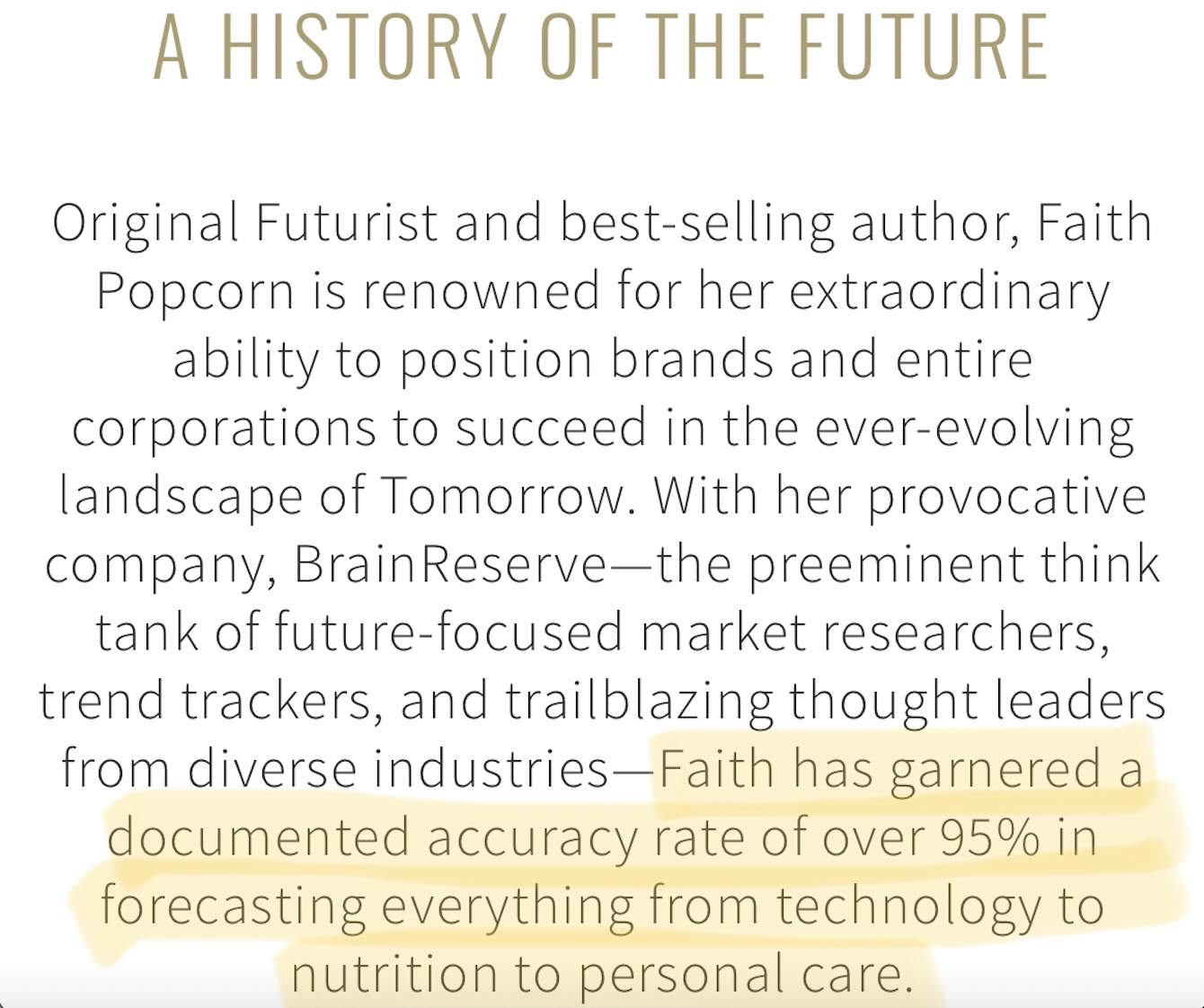 It makes me think about fashion trend forecasters—like Faith Popcorn or people at WGSN. What will be the next swearword? Could they tell us? Can prediction markets be modified to facilitate fashion forecasting? Incidentally, someone keen on prediction markets and with some free time may be interested in this claim Ms. Popcorn makes.