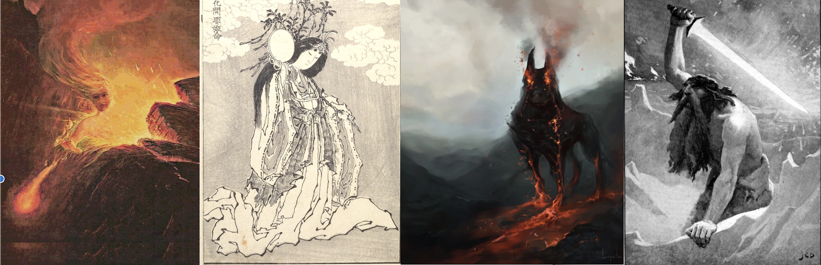 Wikipedia says there are at least twelve instances of deities associated with volcanoes. Not all of them are lucky enough to have easily findable images with licensing permitting republishing, but these four were.