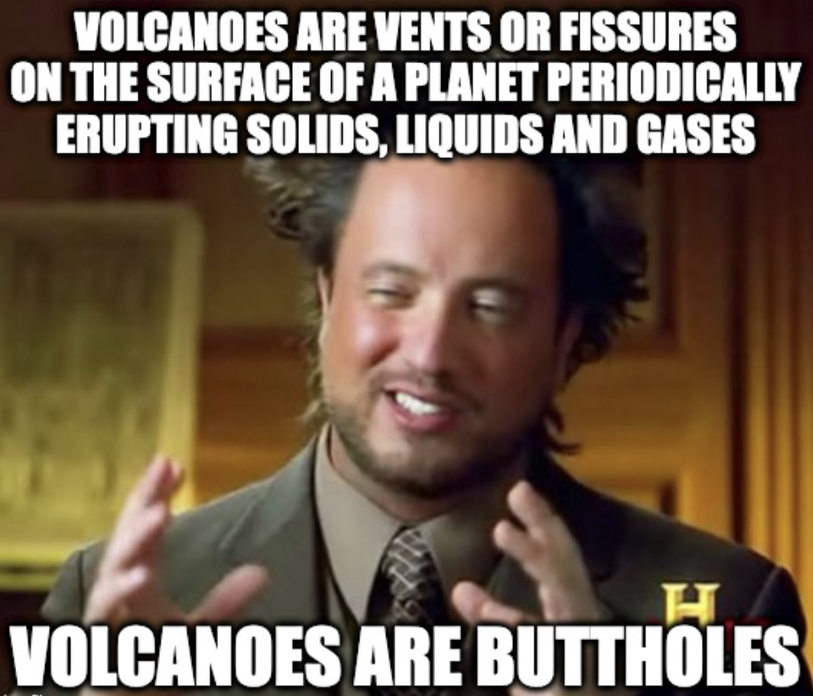 It looks like it bothers volcanologist Mike Cassidy and Lara Mani on the Effective Altruism Forum. They’ve written two excellent posts that, while suspiciously lacking in butthole analogies, appropriately contextualize the existential risk volcanic activity poses to humanity.
