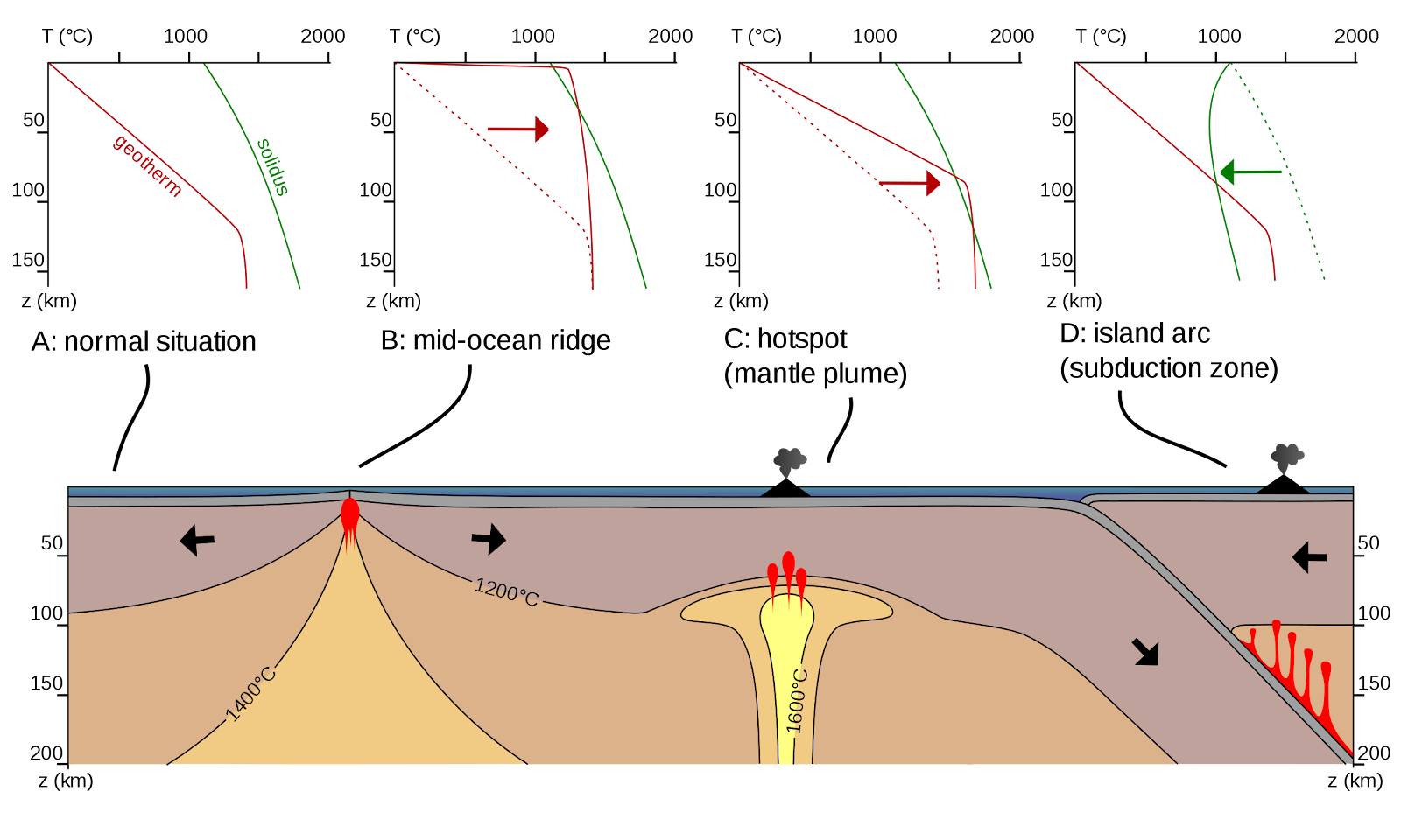 Here’s my back-of-the-envelope “calculation.” According to a YouTube video, magma isn’t actually that hot; it only gets to about 1300℃. Wikipedia says it’s more than 1600℃. If I Google for the alloy with the highest melting point, I get tantalum hafnium carbide, which melts at 3990℃. I know nothing about this material or working with it, but let’s assume that we could use it or something else with a comparable melting point to build a drilling rig like the Deepwater Horizon (which was able to drill to a depth of 10,638 meters), but that could go about 5x or 10x deeper and hit a mantle plume of our choosing.