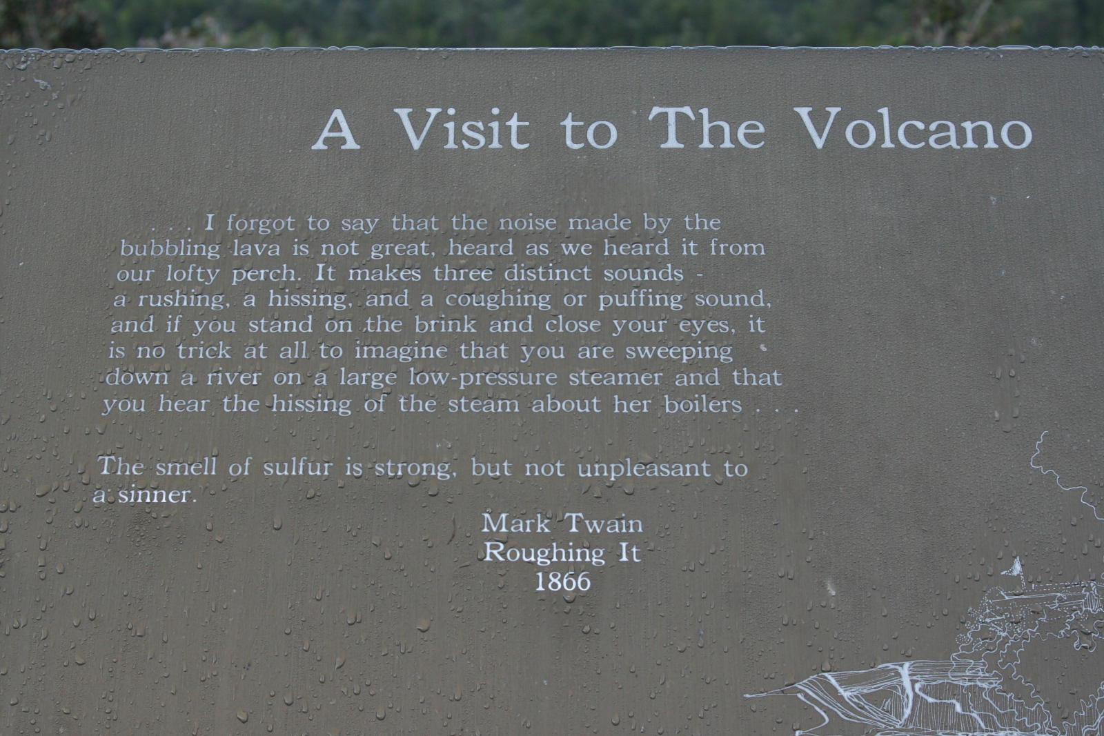 Mark Twain was a travelin’ man. In 1866 he went to the Hawaiian islands (and Pompeii in 1869), while he was there he stayed at the famous Volcano House hotel. He wrote about Kilauea erupting for the Sacramento-based Daily Union. There’s a plaque at Kilauea with a quote from the Daily Union article.