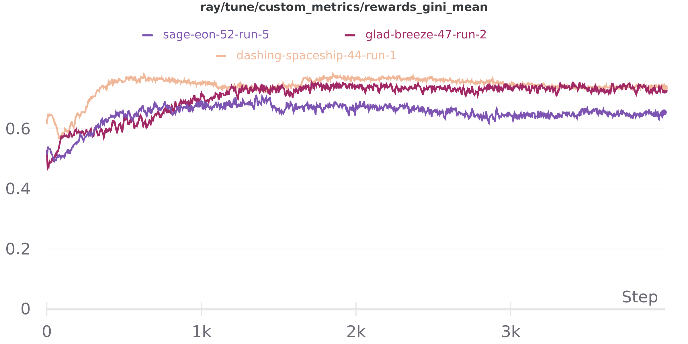 Instead, we spent several months (the bulk of the AISC5 program) implementing our own version of the Harvest environment. This work was undoubtedly useful, as we were able to create a modular and customizable environment for running experiments. However, waiting months to run the first reputation system experiment made it difficult to iterate as the final presentations drew near.