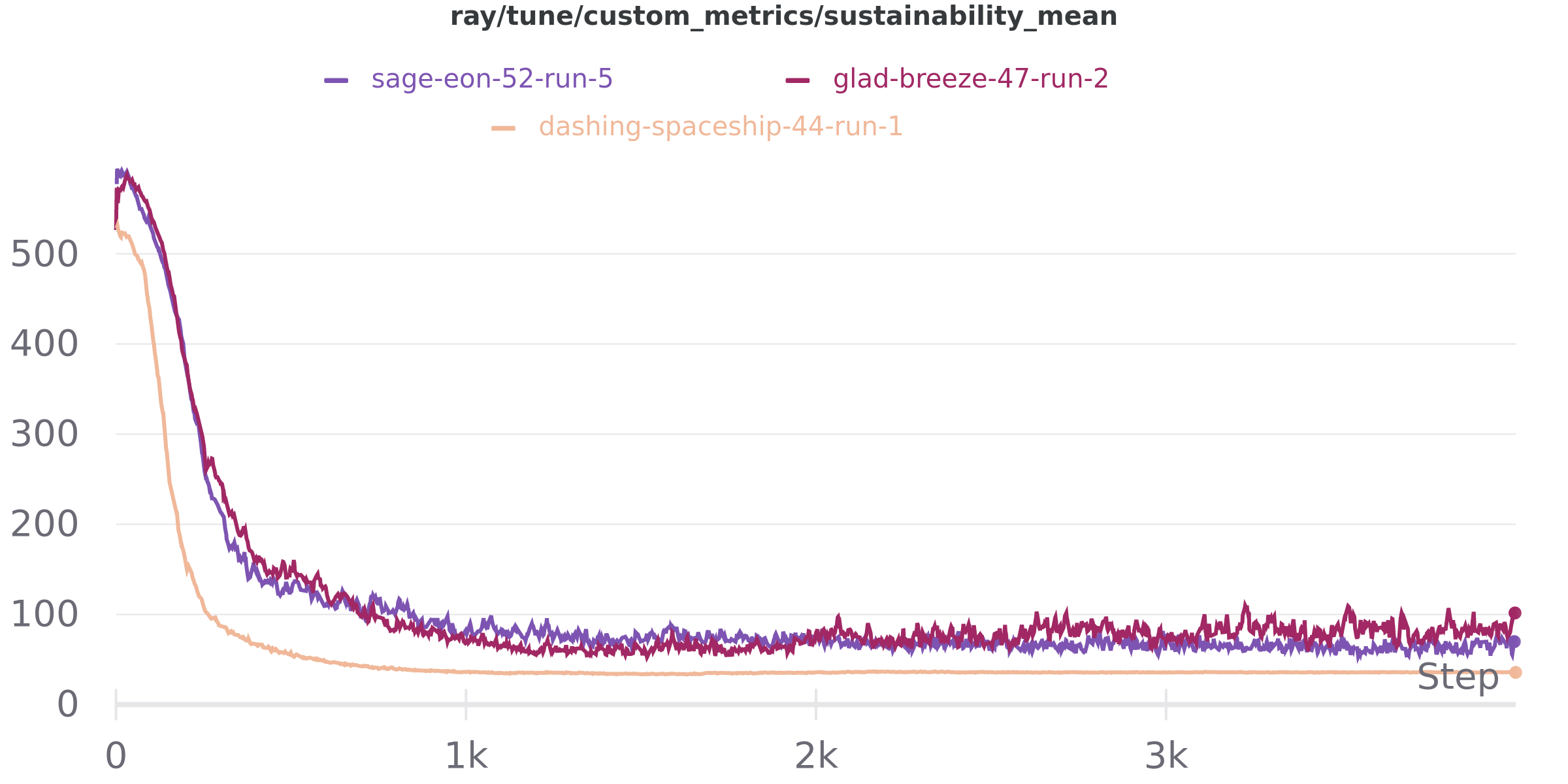 Basing the reputation score on aggression was ineffective. In thinking about tragedies of the commons, we had assumed that violence and selfish behavior would correlate with lower cumulative rewards. However, we observe that the addition of the tagging metric actually led to increased cumulative rewards, at the cost of a lower sustainability. So if the reputation system “punishes” tagging, agents may actually learn to cooperate with their low-reputation counterparts.