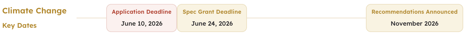 Applications are due by June 10, 2026 at 11:59:59 PM PT via the submission of the S-Process Funding Rolling Application, as well as a submission of the Climate Change Supplemental Application. We will not be accepting late applications.