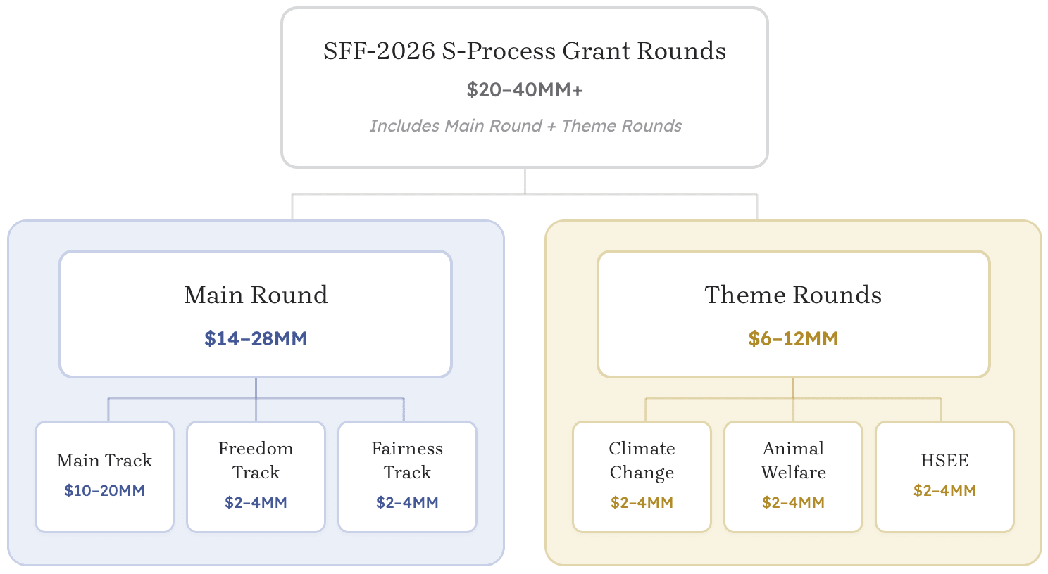 Survival and Flourishing Fund (SFF) is organizing another S-Process Grant Round in collaboration with Jaan Tallinn and Survival and Flourishing Corp (SFC), planning to announce recommendations for all rounds and tracks throughout the Fall of 2026. We estimate that $20MM - $40MM in funding will collectively be distributed across all rounds and tracks:
