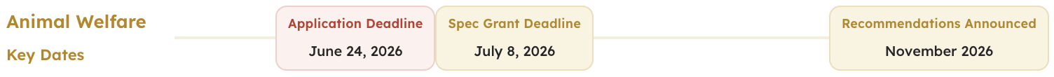 Applications are due by June 24, 2026 at 11:59:59 PM PT via the submission of the S-Process Funding Rolling Application, as well as the Animal Welfare Supplemental Application. We will not be accepting late applications.