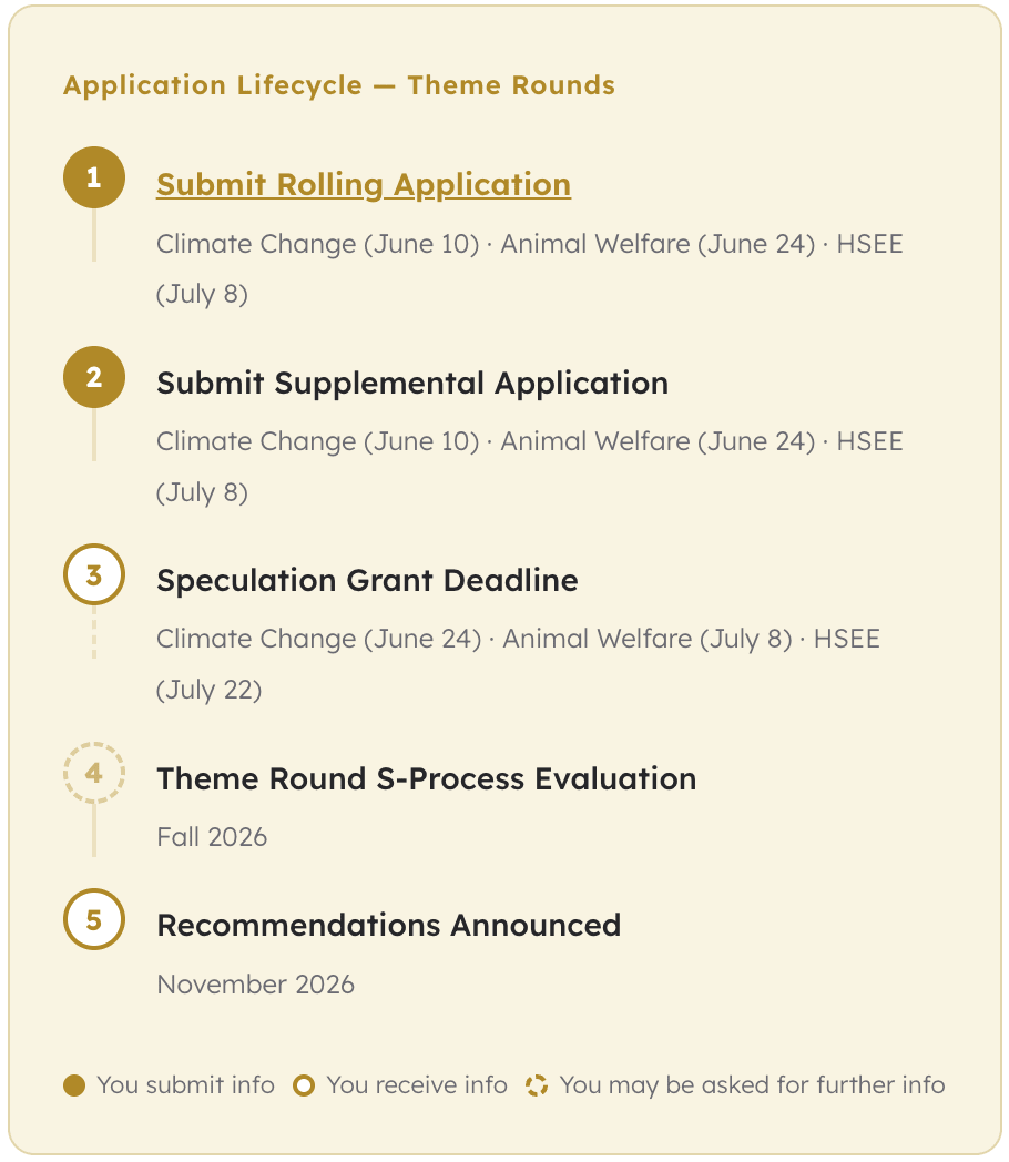 SFF’s Theme Rounds are funding rounds focused on specific cause areas. For 2026, the themes are: Climate Change, Animal Welfare, and Human Self-Enhancement and Empowerment. The application process includes submission of the general SFF Funding Rolling Application, as well as submission of a supplemental application corresponding to the themed grant round they would like to be considered for. To learn more about the themed grant rounds, please see the Theme Round Announcement.