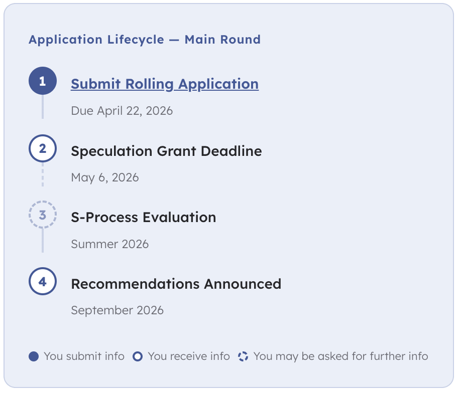 Late applications will not be eligible for the current S-Process Grant Main Round or any SFF Theme Rounds and will instead be potentially eligible for consideration in the next grant round to be announced. Late applications are still eligible for Speculation Grants.