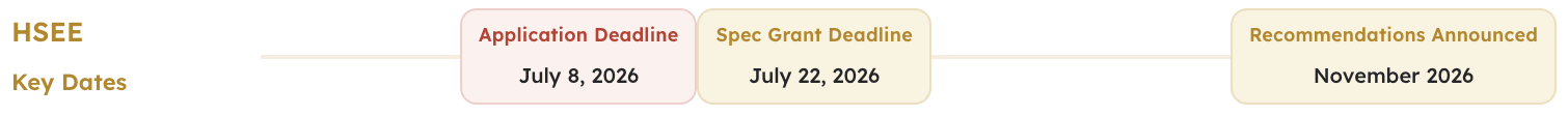 Applications are due by July 8, 2026 at 11:59:59 PM PT via submission of the S-Process Funding Rolling Application, as well as the HSEE Supplemental Application. We will not be accepting late applications.