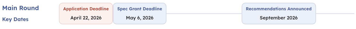 We expect recommendations will be announced by the end of November 2026. You can apply as a charity or for-profit (seeking either investment or non-dilutive funding). We estimate that $2-4MM in funding will be distributed in association with this round.