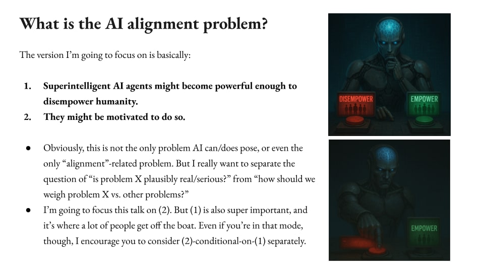 Okay, so with that said, what is the AI alignment problem? Well, the version I’m going to focus on, I’m going to frame using two core claims. The first is that superintelligent AI agents might become powerful enough to disempower humanity. There’s going to be a live option, there’s a course of action these agents could pursue, it’s within their capabilities to pursue such that all humans would end up permanently and involuntarily disempowered.