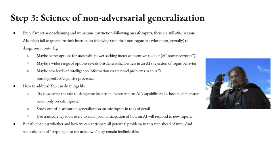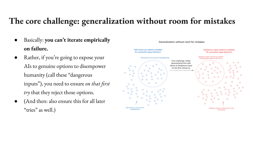 A: Yeah. And then I heard a different thing, which is you’re sort of skeptical about the generalization about room for mistakes where I guess I’m not yet seeing how… So we’ve been at this [slide on “The core challenge: generalization without room for mistakes”], do you reject? Or I guess the specific thing here, it’s not necessarily it’s unprecedented, it’s that if you want to not be disempowered in the relevant sense, then by the time AI is deployed on options where it has a reasonable chance of disempowering you, it needs to reject those options. So you need to get that right.