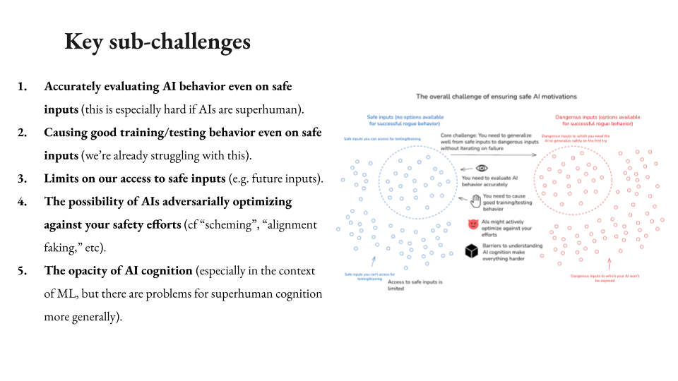 So now, that said, I think there’s a few other sub-challenges that make this problem hard. So one is that accurately evaluating AI behavior even on the safe inputs gets difficult when the AIs—I mean, it’s difficult period for various reasons, but it’s especially difficult when the AI are superhuman because the humans might not be able to understand the relevant behavior, there might be scarcity of oversight. A bunch of ways in which evaluating superhuman AI behavior might be harder than usual. So you might not even know what’s going on as much as you’d like, even on the safe inputs.