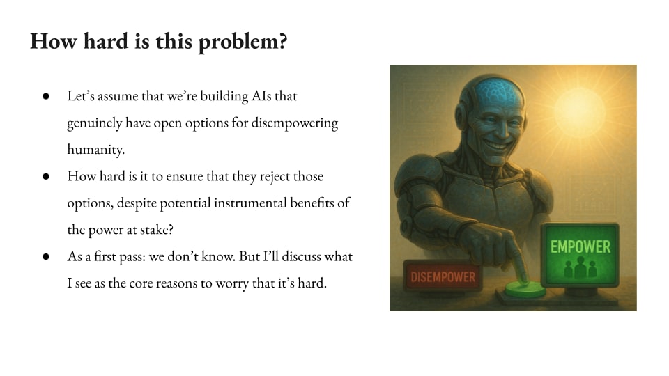 Okay, so that’s the broad sort of concern here. How are we doing? Okay, well, let’s see how much of this we get through. Okay, so let’s assume we have some systems that are in a position to take over the world, in a position to disempower humanity. And let’s assume that they’re at least agentic in the sense I just described that they have long-term motivations of some kind that are focused on. So they’re sort of candidates for this sort of behavior. How hard is it to ensure that they reject the option to pursue human disempowerment? That’s the question I want to look at.