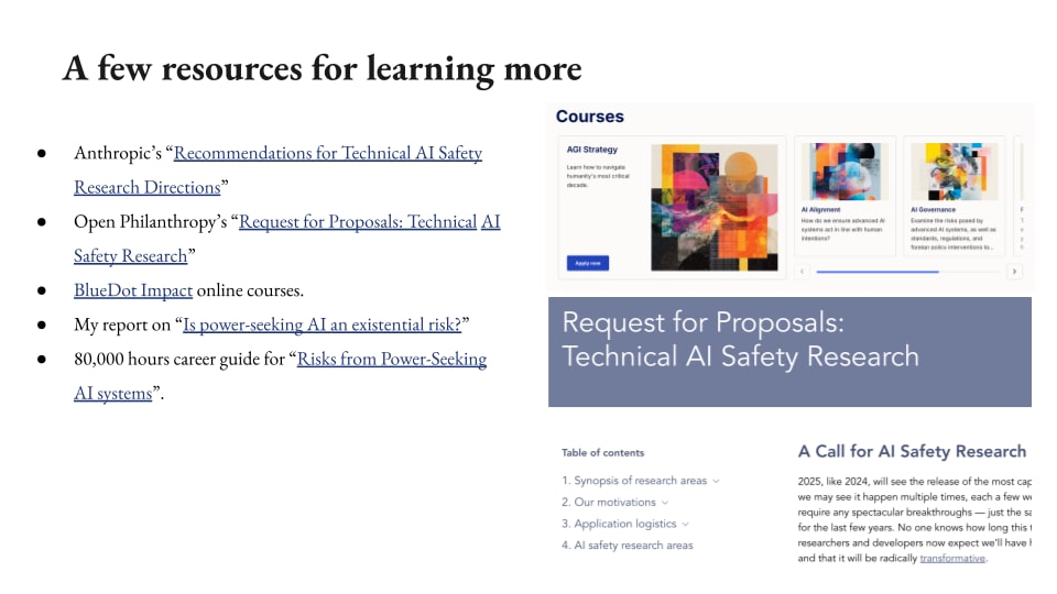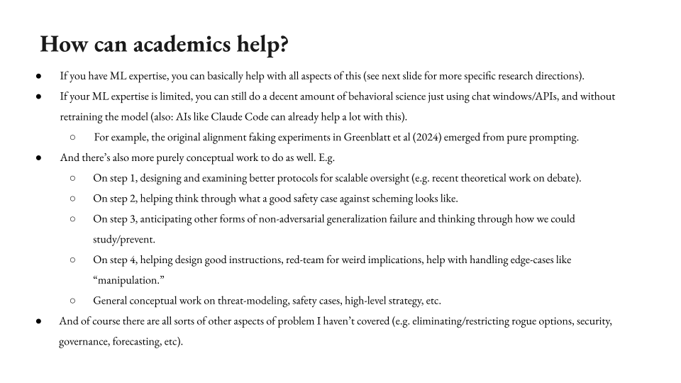 And I’ll just end here with how can academics, like the folks in this room, help? Well, if you have ML expertise, then you can basically help with all of this. I’m linking in the next slide to some resources that have a bunch of technical research directions you can pursue. So if you’re comfortable with a reasonably full stack of retraining ML systems and doing empirical experiments, there’s just a ton of work to be done. If your expertise is limited, you can still do, in my opinion, a decent amount of behavioral science just using chat windows/APIs and without retraining the model.