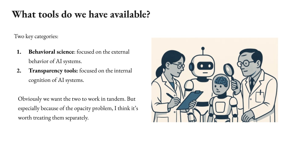 One is we study the behavior of the systems. We leave the opacity issue unresolved, review the AIs from the outside, but we study the behavior in depth. I’m calling that behavioral science.