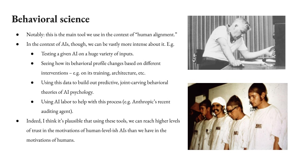 Now obviously, humans, we might not be comfortable giving them the option to disempower humanity or take over the world either. In fact, I think we shouldn’t. But I want to distinguish between the question of is the problem that the AIs are AIs as opposed to humans and the separate problem of any agent reach having the option to disempower humanity? And I think we might be able to at least reach the level of trust that we have in humans via behavioral science.