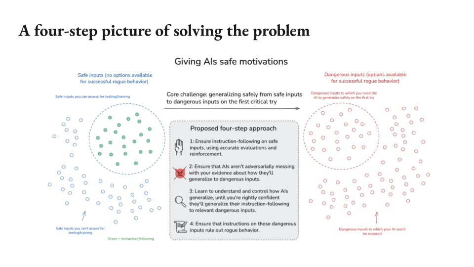 And so that said, there are some edge cases that are tough. Maybe we need to think about things like manipulation. Maybe there’s extreme circumstances we didn’t anticipate where even common-sensically interpreted instructions lead to rogue behavior. So people need to red team that, anticipate those dynamics. And I think they should use AI to help. And if you have AIs that are going to follow instructions even on dangerous inputs, then you’ve got a lot of juice in terms of the AI labor you might be able to mobilize for getting this last step right. So that’s step four, that’s the full picture.