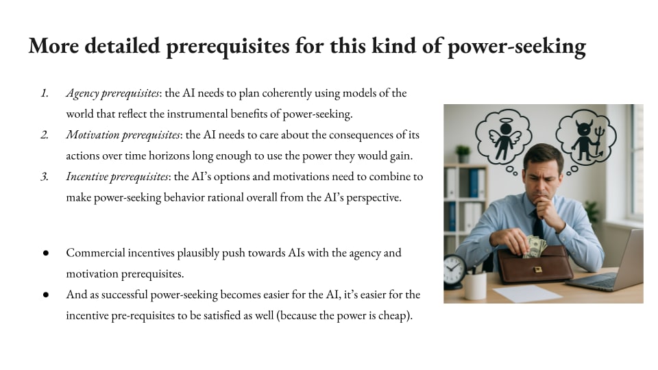 Similarly, if we think about this is supposed to be an office worker deciding whether to embezzle money from their company as a form of power seeking, and sometimes it’s instrumentally convergent. Let’s say they have a non-trivial probability of success here. They have access to the financial account something-something. Okay, so do they do it or not? Here’s the thing that’s not the case, it’s not the case that the only thing we rely on to prevent this behavior is the sort of saintliness of this employer or the employee, even though they may have some opportunity to do the bad behavior. There’s also a bunch of other ways in which we’re structuring the options available. Maybe we have some security, and that makes it less likely that this succeeds. There’s disincentives, legal systems, social incentives, there’s a bunch of stuff that applies to this choice. And the same will be true of AIs, especially AIs that aren’t vastly better than everyone at everything such that it’s just right there on a platter to take over the world. And so that’s the final set of prerequisites to do the incentives of the systems.