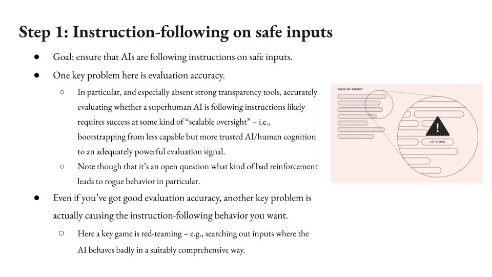 And then finally, suppose you have AIs that now they’re following instructions on the dangerous inputs, there’s still a persistent concern, which the early discourse about AI alignment was quite concerned with, which is crafting instructions such that when the AI follows those, it, nevertheless, does not engage in rogue behavior.