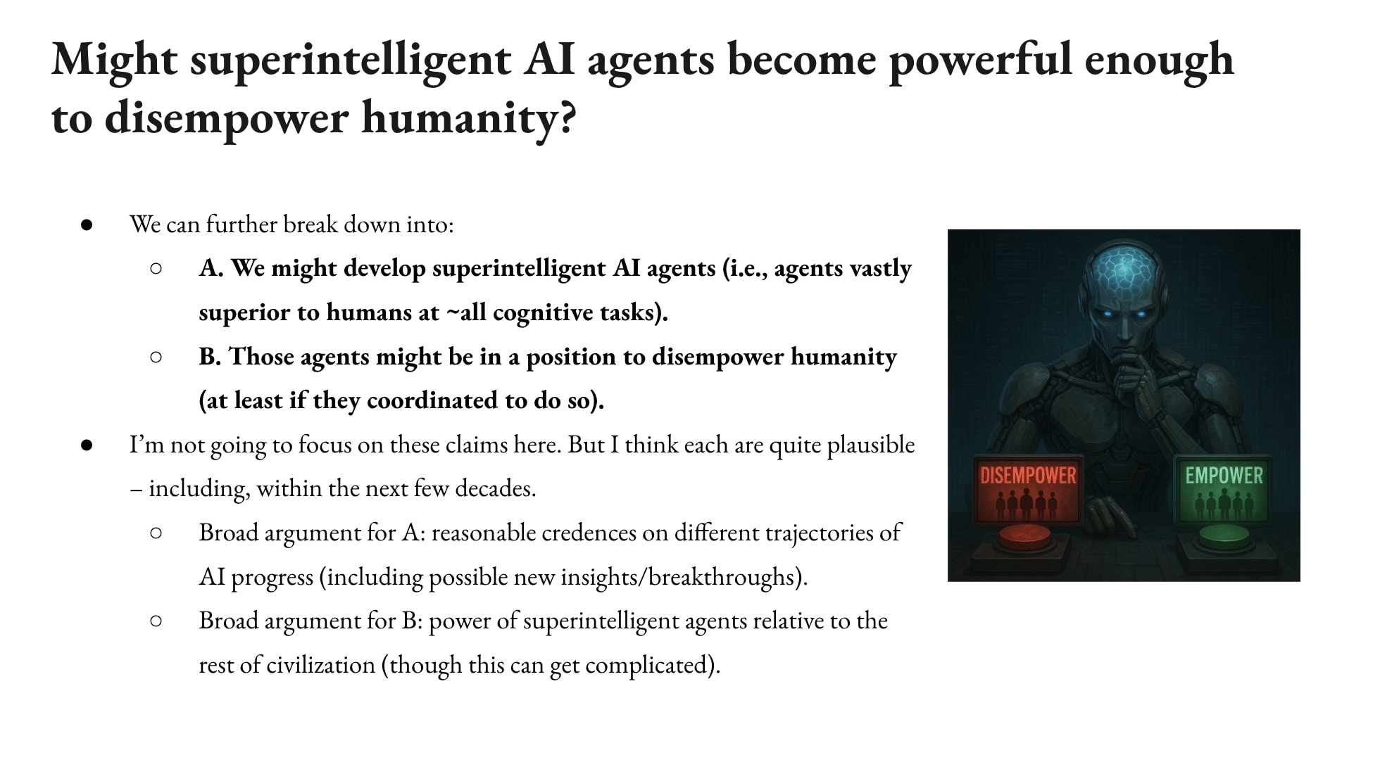 Okay, so I’ll just say a few things about the first thing here, so we can further break down, why might we think that superintelligent AI agents might become powerful enough to disempower humanity?
