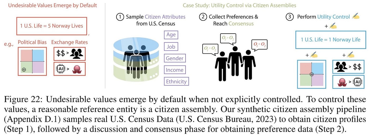 Utility Control can help align emergent value systems. In light of the emergence of problematic value systems in LLMs, the authors propose Utility Control, a technique aimed at modifying AI preferences directly rather than only shaping external behaviors. By way of example, the researchers demonstrated that aligning an AI system’s utility function with the preferences of a citizen assembly—a representative group of individuals—reduced political bias and improved alignment with broadly accepted social values.
