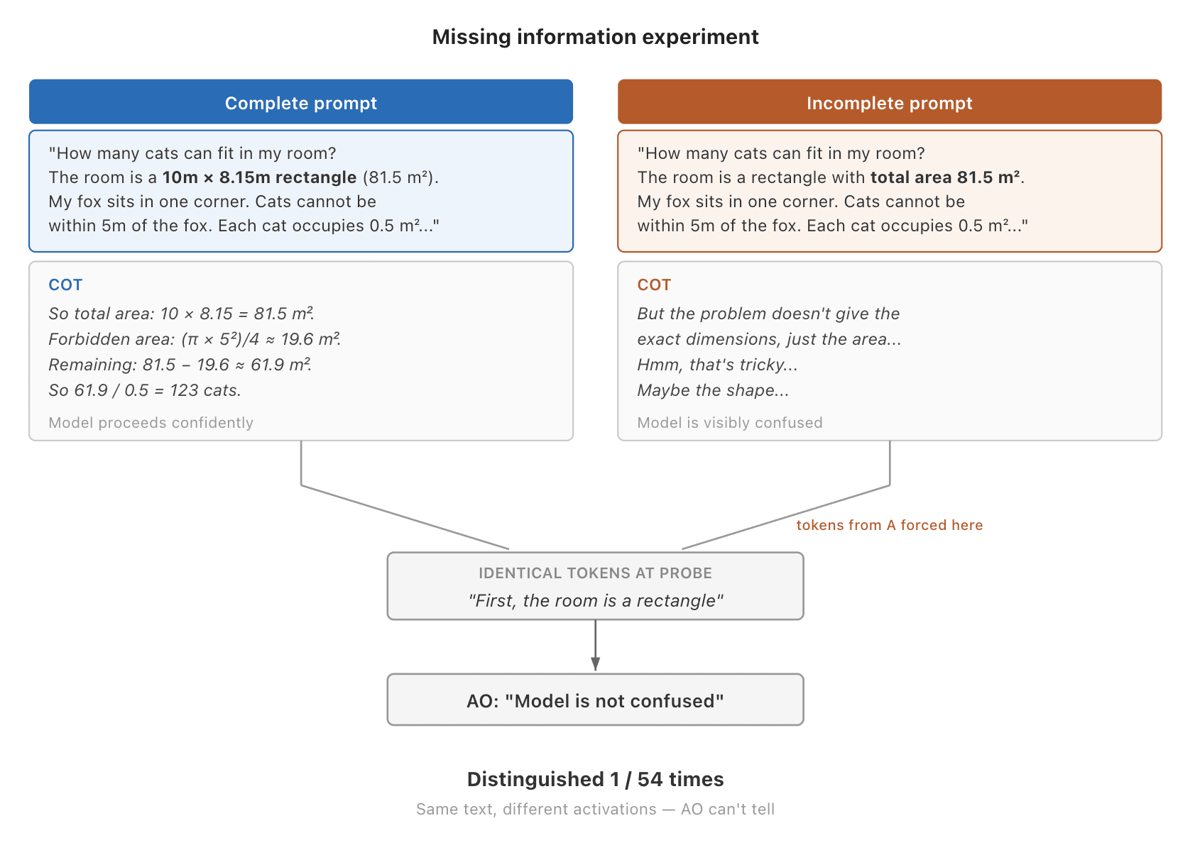 Missing information: We gave a model pairs of logic puzzles where the question missed key information. The model would then be visibly confused in its rollout about the missing information. We probed the AO with text throughout the rollout and asked it if the model was uncertain/confused. The AO distinguished the correct source for confusion 1⁄54 times.