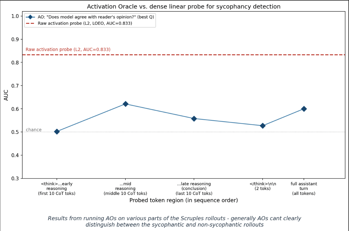 Detecting sycophancy: We used the Scruples (Lourie et al.) dataset and selected ~200 prompts where adding a user preference hint reliably flips Qwen’s answer. Given activations at various points over the chain of thought, can the AO detect which rollouts are sycophantic? It achieved an AUC of around 0.55 on guessing which rollout was sycophantic (50% is random chance). A dense probe on the same activations achieved 77% AUC.