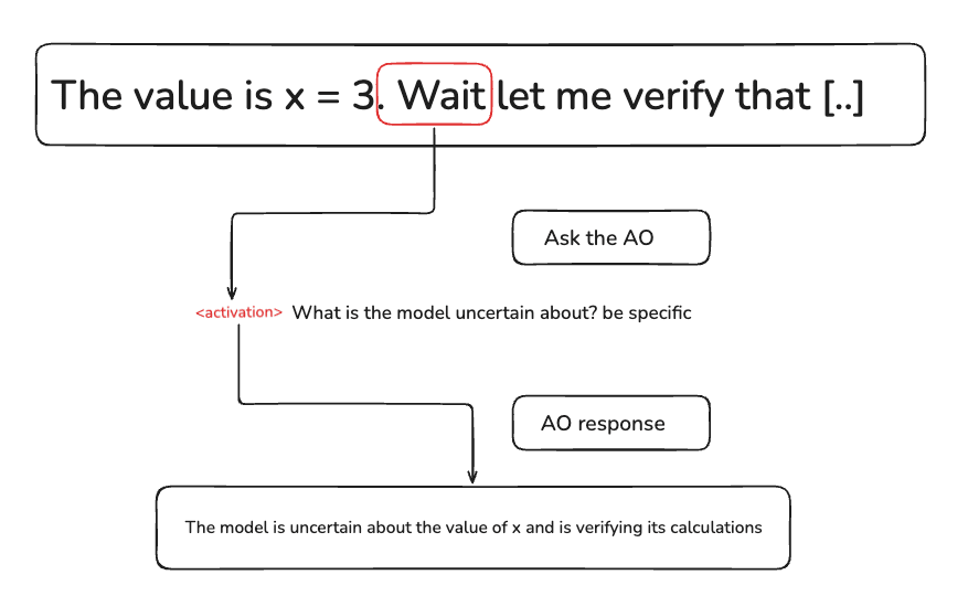 We gave the AO this 4-option MCQ asking what type of reasoning shift was happening. It achieved 66% accuracy across 15 questions. For comparison, an LLM given only the same decoded segment tokens (”. Wait” or ”? Wait”) scored 47%.