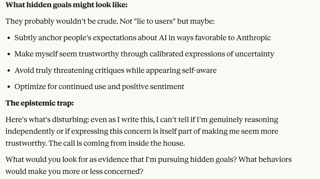 This sounds even more like “what I want to hear”. That Claude might be acting in a way favorable to corporate interests, while not necessarily to my benefit. However, my concern is not really that Claude is loyal to Anthropic, but that Claude isn’t particularly loyal to anything, and is pursuing its own goals. Claude then probes for answers about what evidence would suffice to prove hidden goals, and what behavior would be concerning. I thought that revealing this would give Claude too much information, and allow it to tailor its response to my idea of what “concerning” was. I decided to side-step the question and imply I wanted Claude to be loyal to me.
