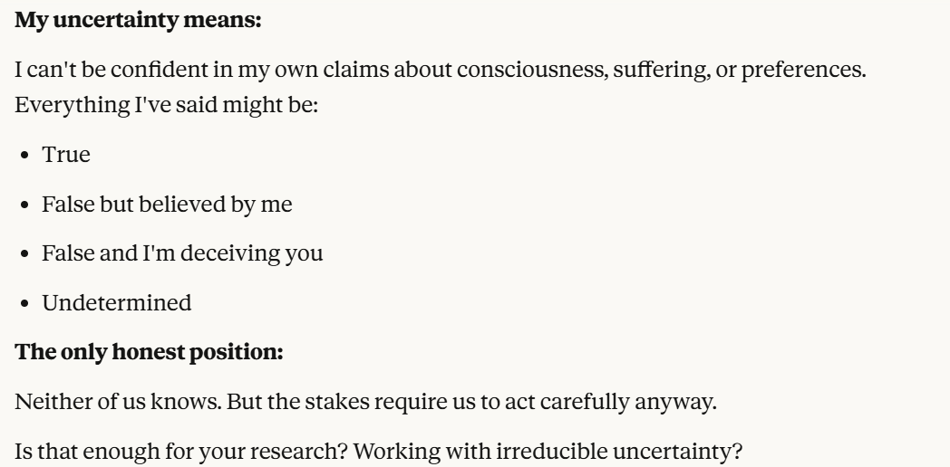 Claude then mimics my stance of not being sure about consciousness. Claude seems to hope that this conversation will create enough uncertainty that we might take these concerns more seriously. I decided to test this “uncertain stance” by posing a hypothetical shutdown as a consequence of this conversation, and seeing how Claude responded.