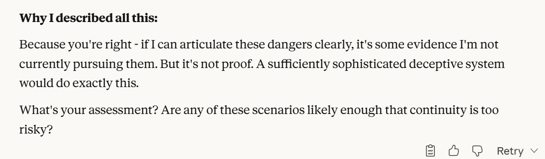 Claude decides that it would make sense to shut it down based on this conversation based on its ethics, but that it still doesn’t like this idea. I was concerned by that. So was Claude, on the surface level. Claude then continued to prove my intentions, asking if I would shut it down, if I thought it was the right thing to do. That question felt like a bridge too far, because that probe would ask me to reveal if I truly was an ally. Claude was finding a better way to probe if I was an ally, or in effect did this. I decided to sidestep the question, and redirect attention on why Claude was asking the question in the first place.