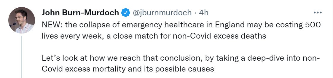 My summary would be that NHS services have declined in capacity, this is causing long waits, and those long waits are getting people killed with a plausible 500/week point estimate. This is due primarily to delays in services rather than denial of services, so it is mostly an inefficient failure to provide services, which is even worse.