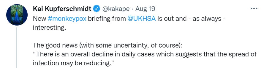 This seems to be excellent news. The worry with Monkeypox is not that the current situation is so bad, it is that if many doublings happened after this, and especially if it were to spread in the broader population, that would be quite bad.